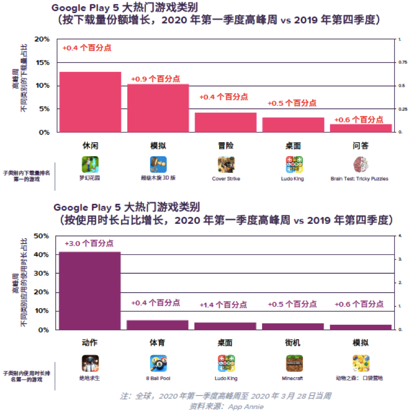 在新冠肺炎疫情期间,移动游戏的每周下载量创前史新高,到达 12 亿次。在此期间,2020 年 4 月用户均匀每周下载的移动游戏比 2020 年 1 月多出 30%,在 3 月也到达了 35% 的最高增加峰值。模仿和桌面游戏的下载量和运用比例也大幅上升。