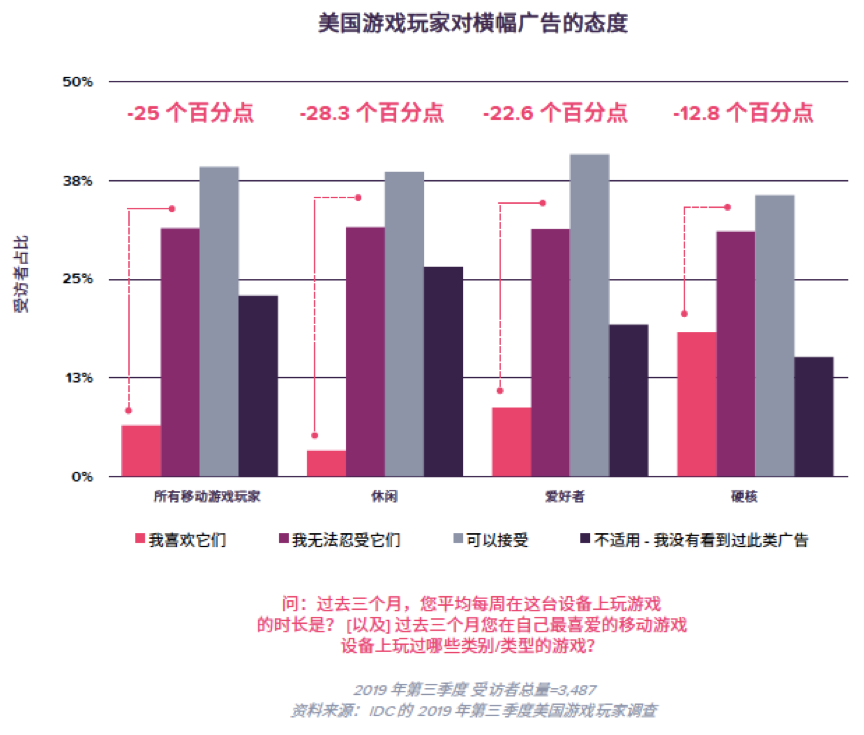 跟着移动广告开销继续攀升,运用程序开发商正在装置SDK(软件开发工具包)以完成广告变现。初次装置广告SDK的游戏在下载量和MAU(月活泼数)方面均有所增加。广告商也在他们的用户购买活动中使用更多的广告渠道,这表明商场现已老练。美国2019年第三季度的调查结果显现,硬核手游玩家反而比休闲游戏或中核游戏玩家更容易接受广告。