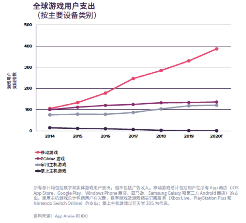 2019年,全球游戏类其他总运用下载量占比不到40%,却发明了挨近 70% 的 iOS 和 Google Play 归纳运用开销;移动游戏的规划和发展速度都将继续逾越PC/Mac游戏或家用主机游戏。获益于用户数量和均匀用户开销的添加,移动游戏将进一步扩展全球抢先优势,其用户开销可到达 PC/Mac 游戏的 2.8 倍以及家用主机游戏的 3.1 倍。